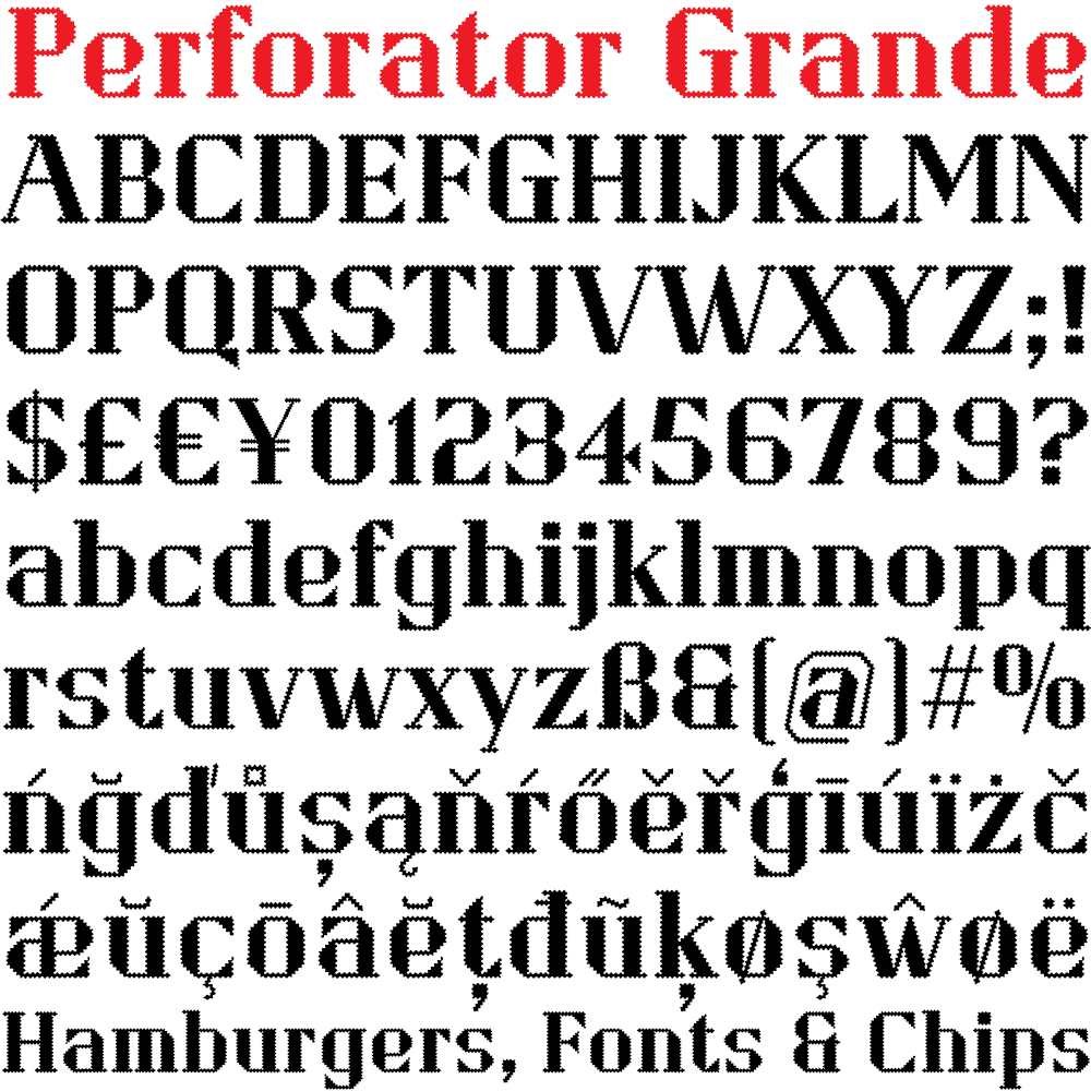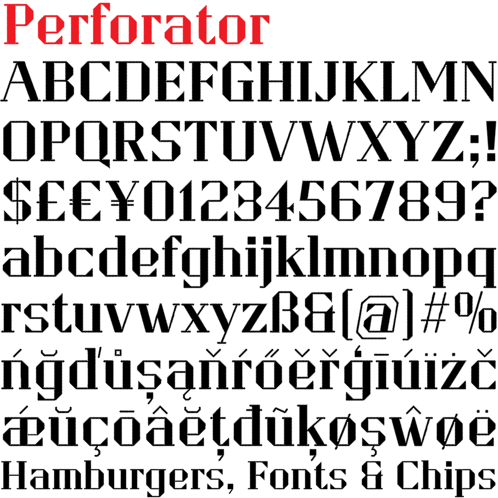 For post offices, mail systems, philatelists and stamp dealers, Perforator is the perfect visual signifier for any kind of ‘stampiness’. A full complement of Latin Extended-A characters is included.